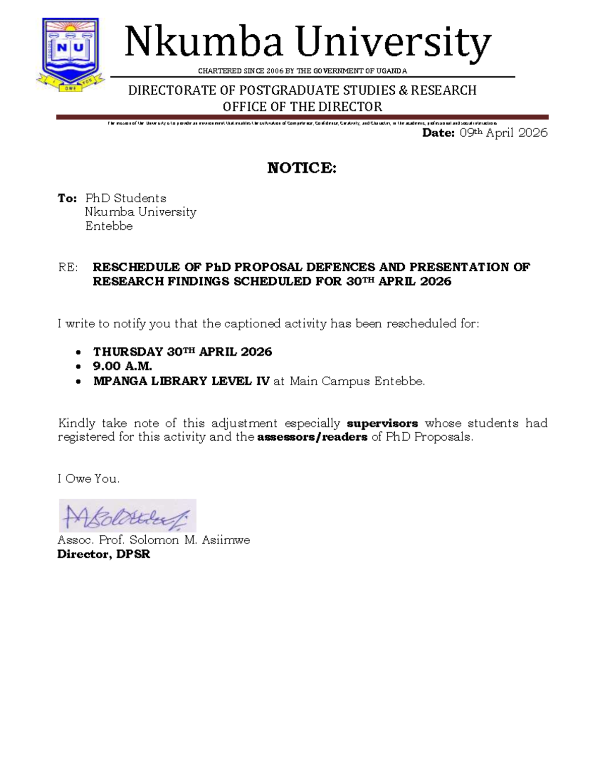 Nkumba University PhD Proposal Defence Reschedule Notice - 30th April ...