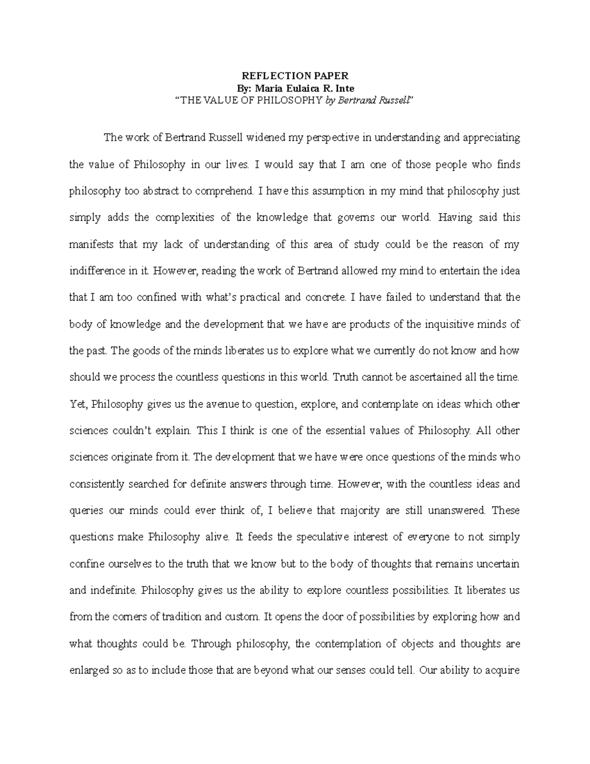 Reflection paper- the value of philosophy by bertrand russel - By ...