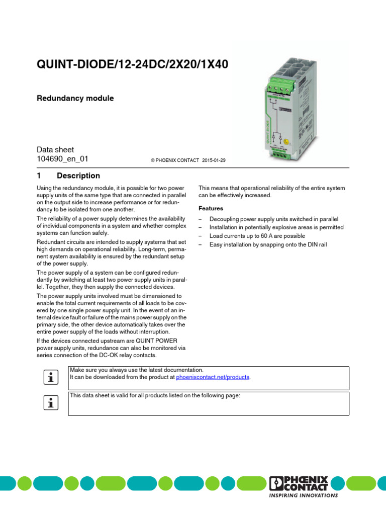 Phoenix Redundancy Module QUINT-DIODE 12-24DC 2X20 1X40 - 2320157 | PDF ...