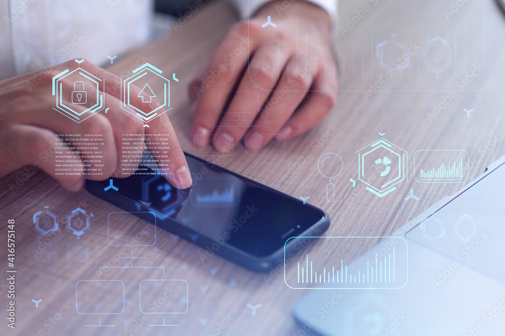 Programmer holding in the hands a smart phone and testing an innovative ...