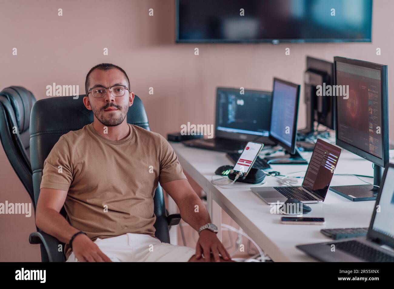 Professional Male Programmer Multitasking with Phone at Work | Premium ...