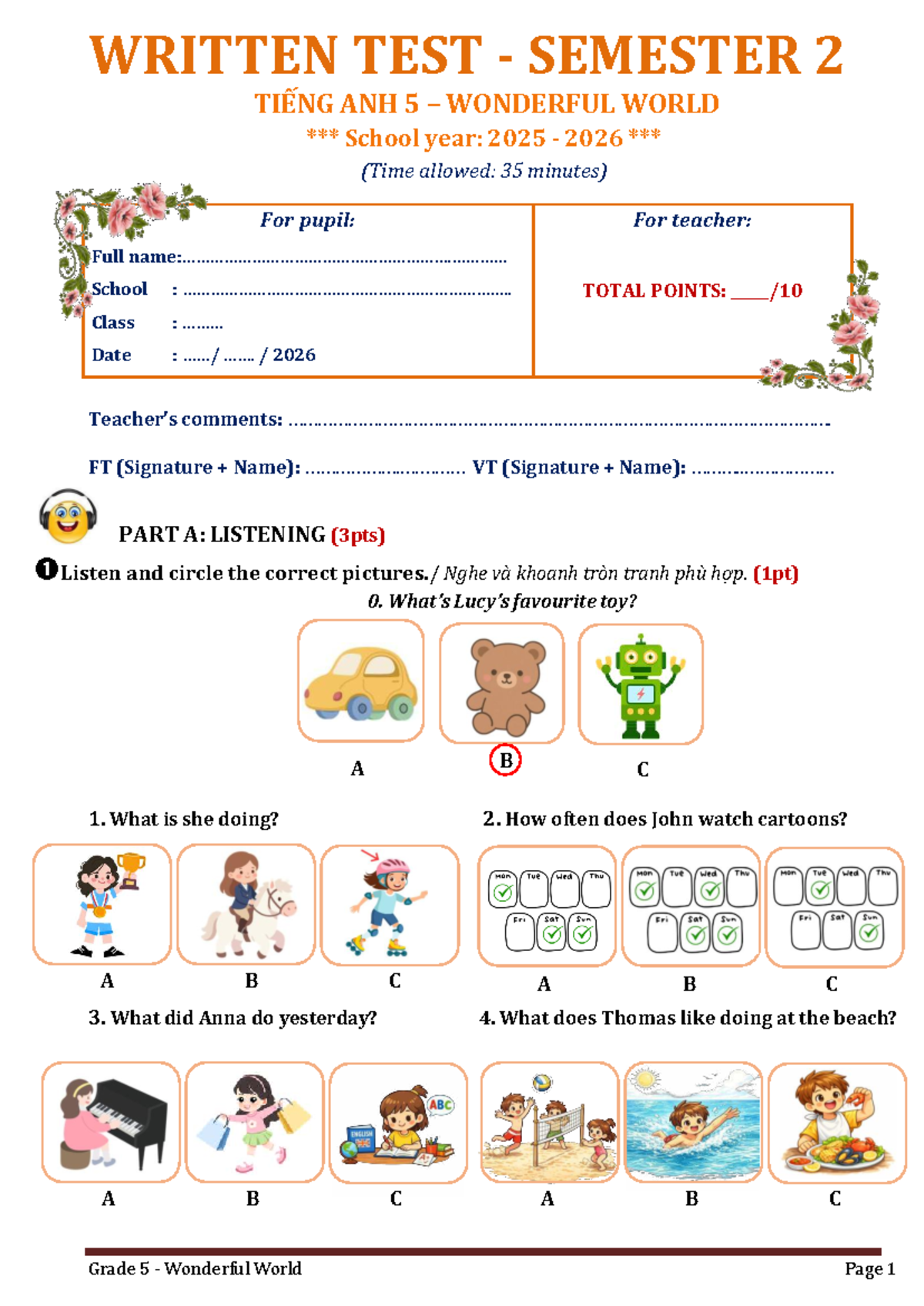 WRITTEN TEST - SEMESTER 2 - TIẾNG ANH 5 - WONDERFUL WORLD - Studocu