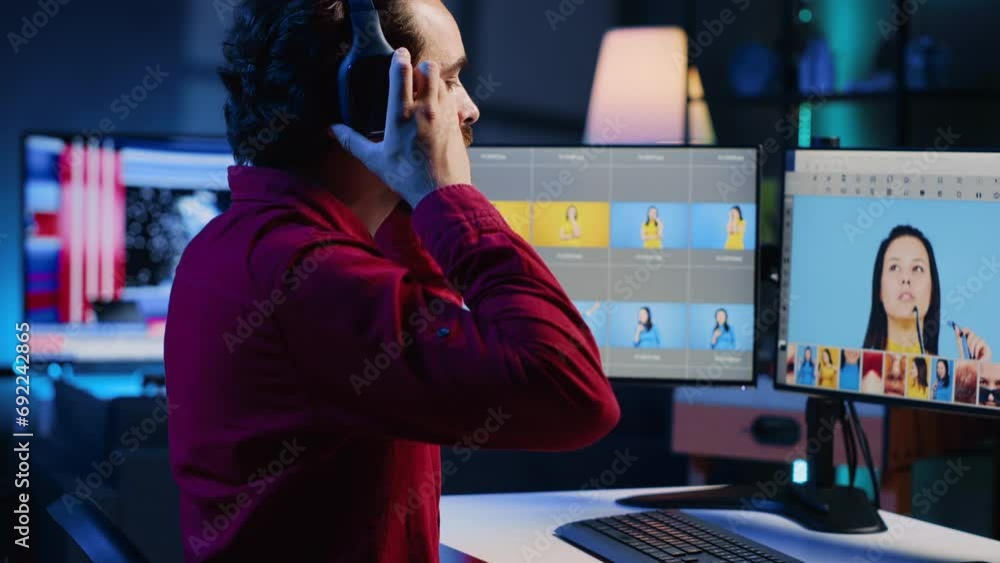 Male photographer working on image editing with retouching software ...