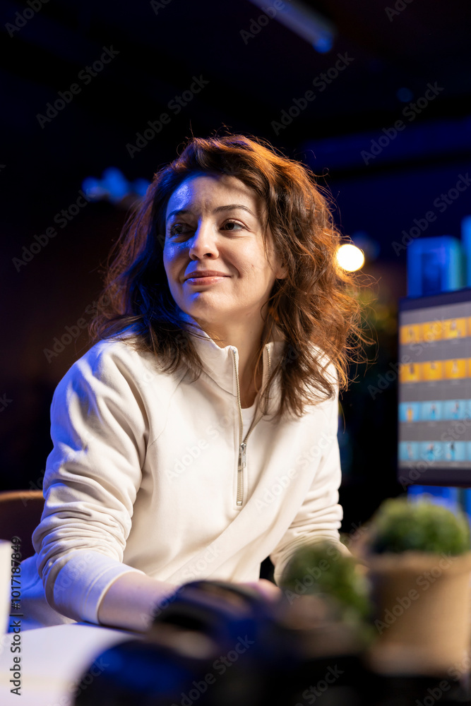 Smiling photographer creating digital portfolio to showcase work after ...
