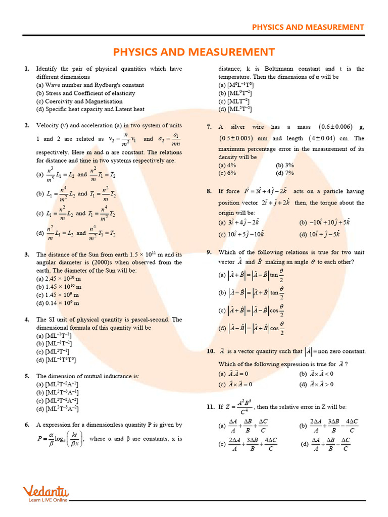 JEE Main Physics and Measurement Practice Paper With Solutions Download ...