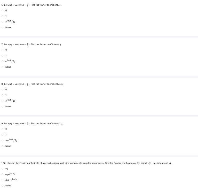 [Solved]: Let x(t)=sin(10 pi t+( pi )/(6)). Find the fourie
