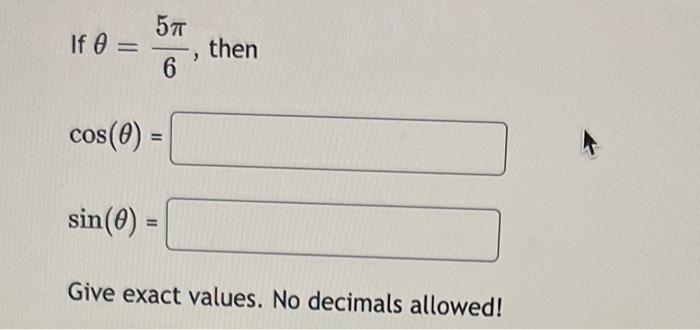 Solved If θ=65π, then cos(θ)= sin(θ)= Give exact values. No | Chegg.com