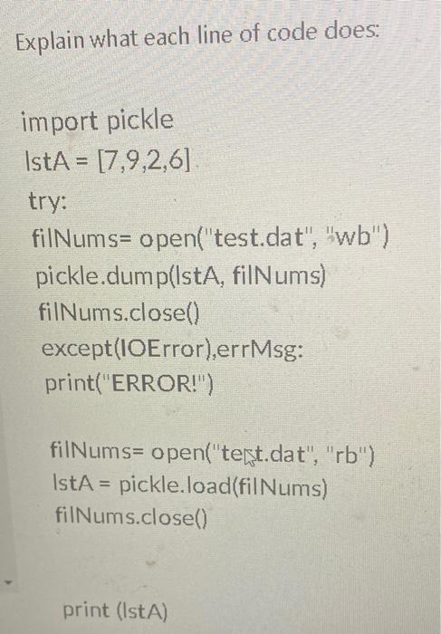 Solved Explain what each line of code does: import pickle | Chegg.com
