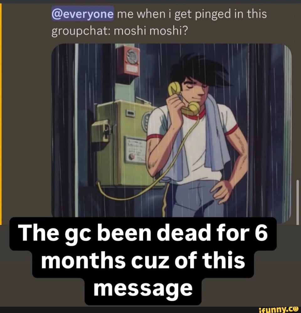 @everyone me when i get pinged in this groupchat: moshi moshi? I The gc ...
