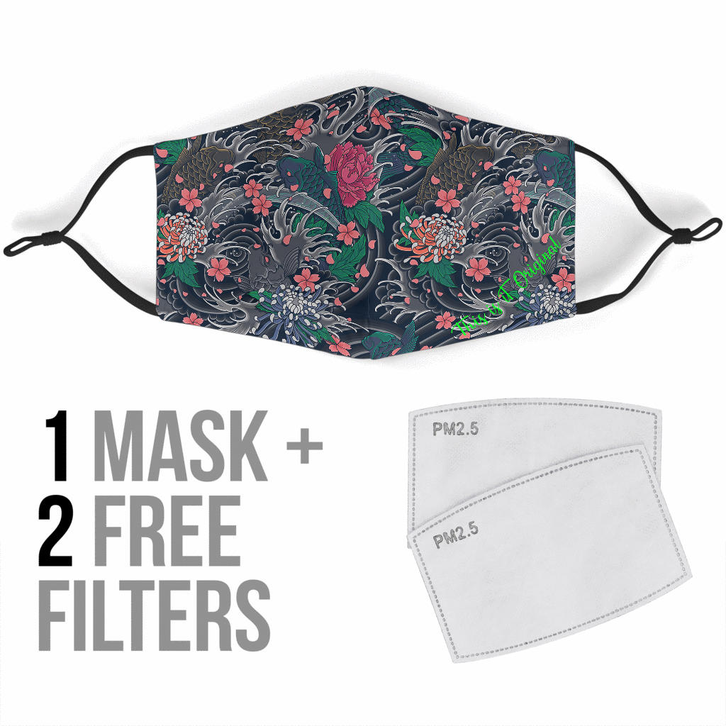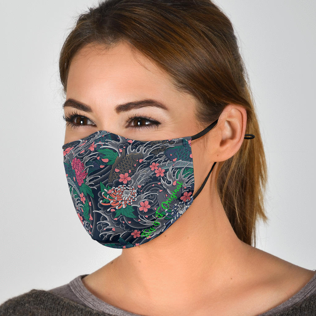 Japanese Grey Wave & Pink Flowers With Koi Fish Protection Face Mask ...