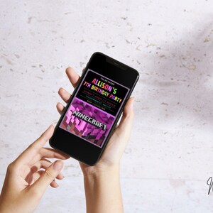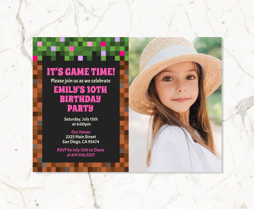 Photo Pink Pixelated Invitation for Girls, Pink Minecraft Invitations ...