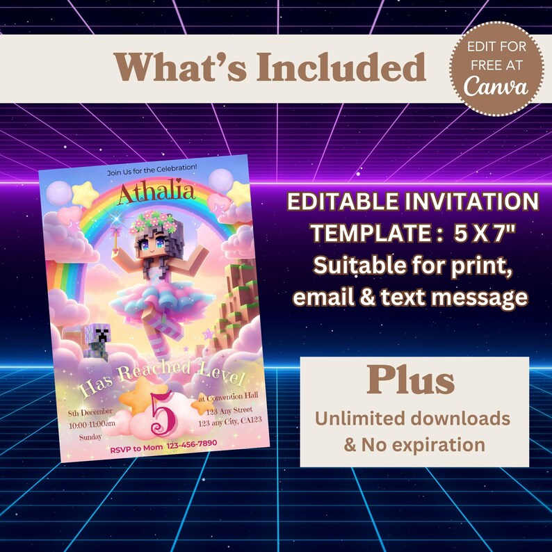 Editable Girl Minecraft Birthday Invitation, PINK Mine Pixel Craft ...