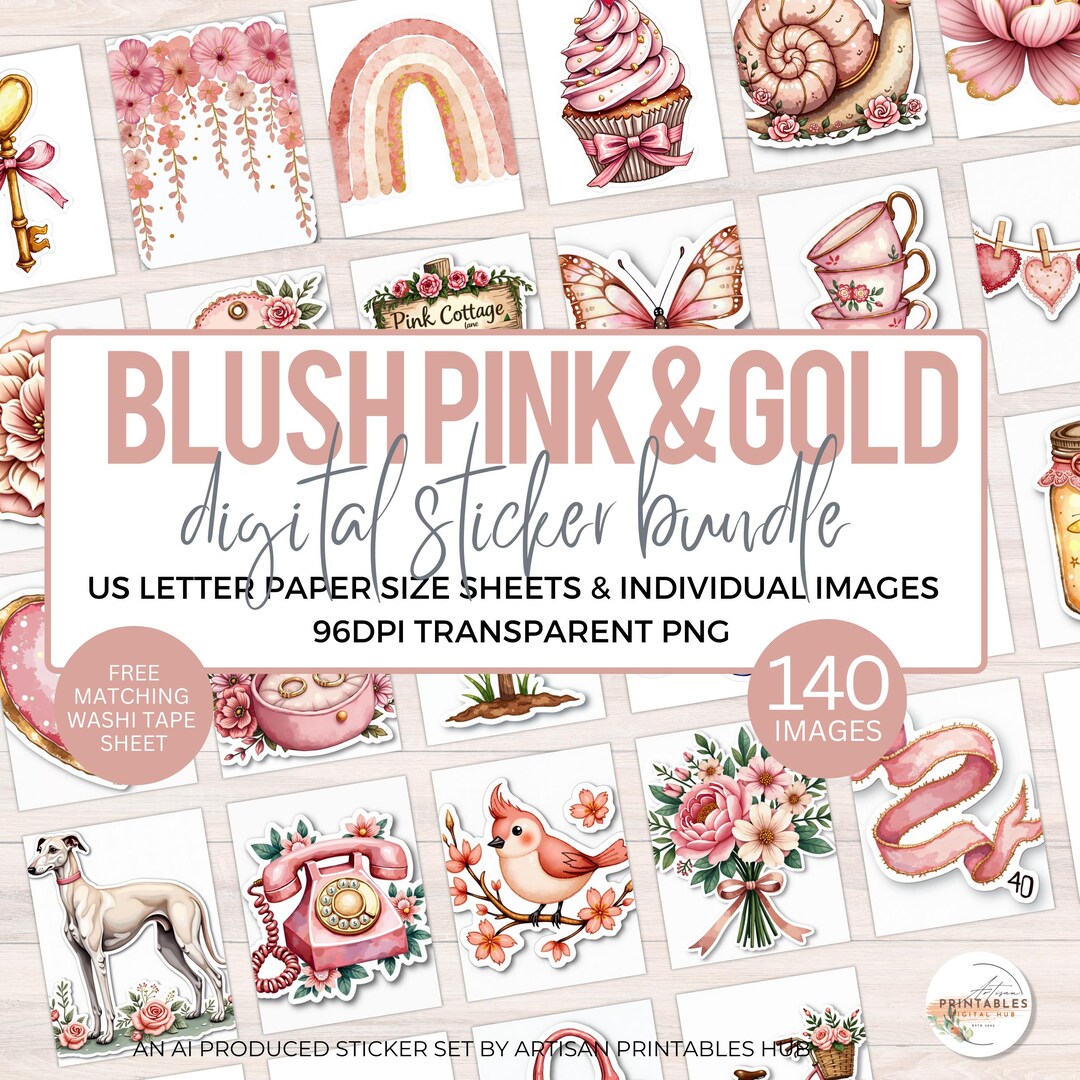 Gold & Blush Pink Stickers, Cottagecore Digital Stickers for Planner ...