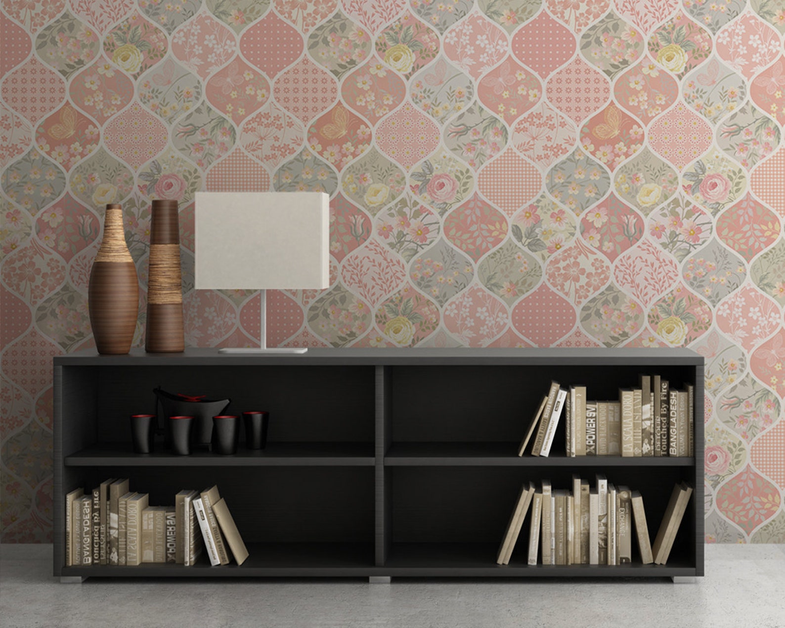 Pink and Beige Patchwork Wallpaper with Flowers