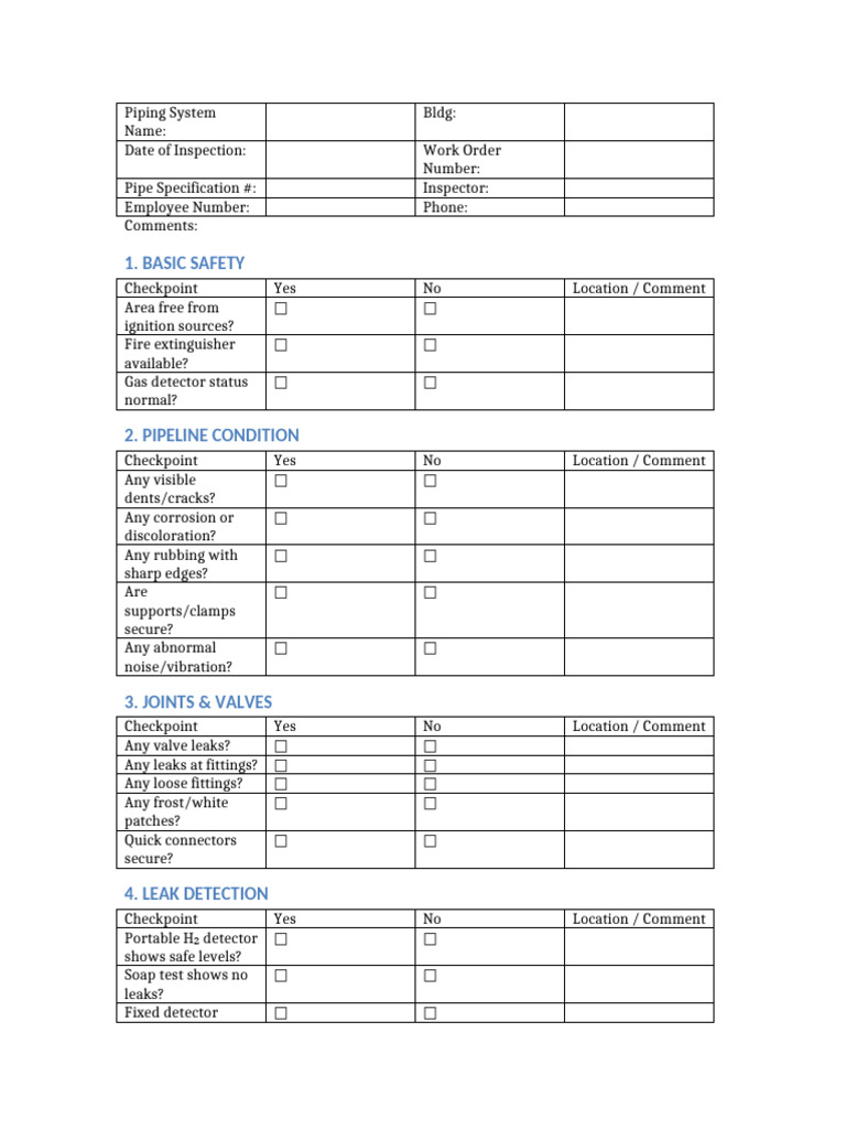 Hydrogen Pipeline Inspection Checklist Format | PDF