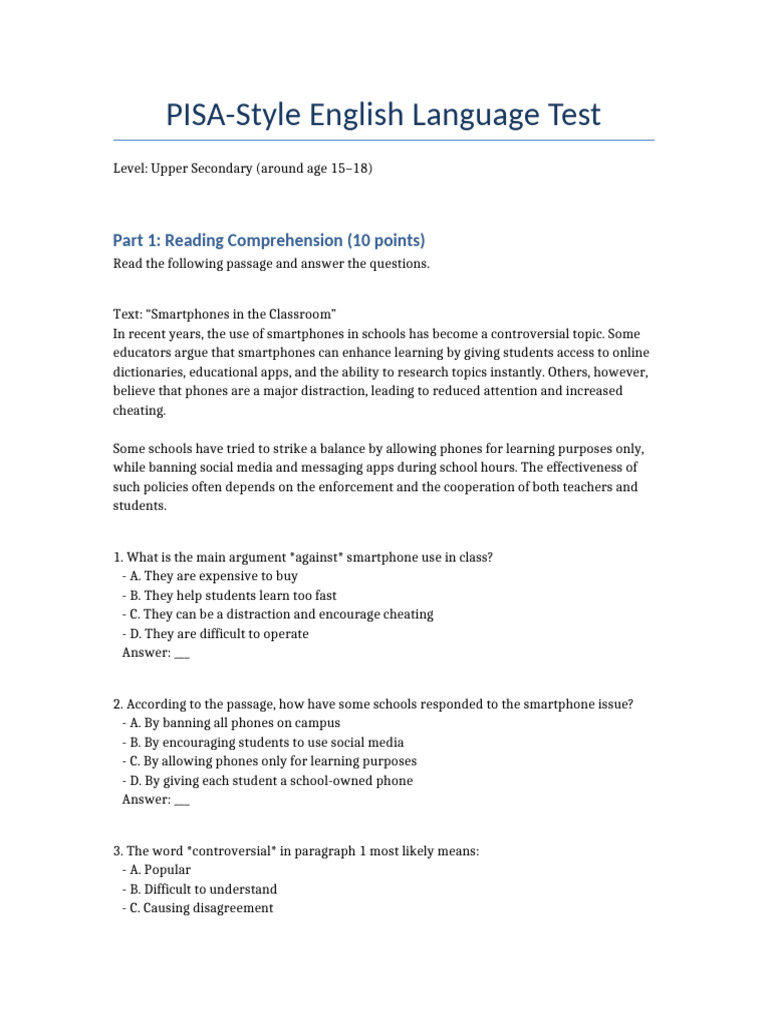 PISA Style English Test With Answers | PDF | Reading Comprehension ...