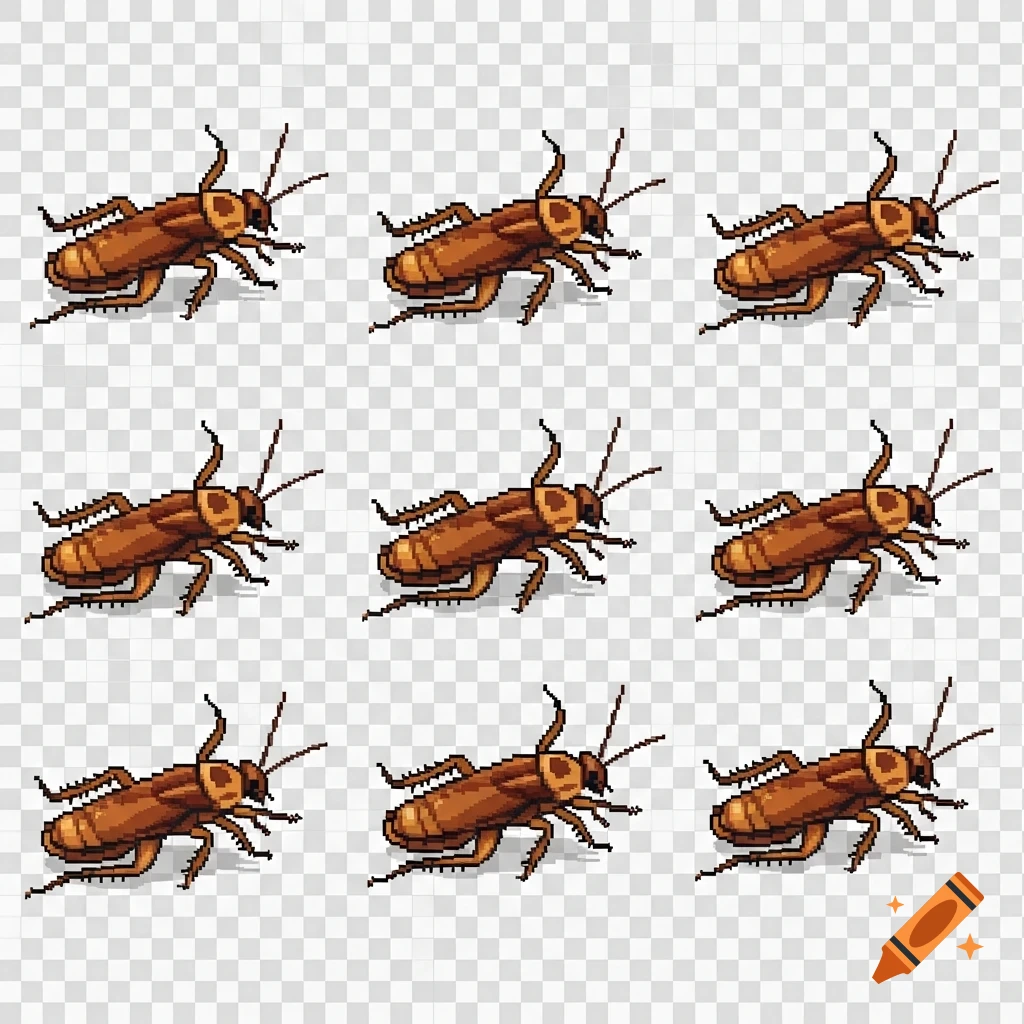 Nine identical pixel art cockroaches are shown from a top-down ...