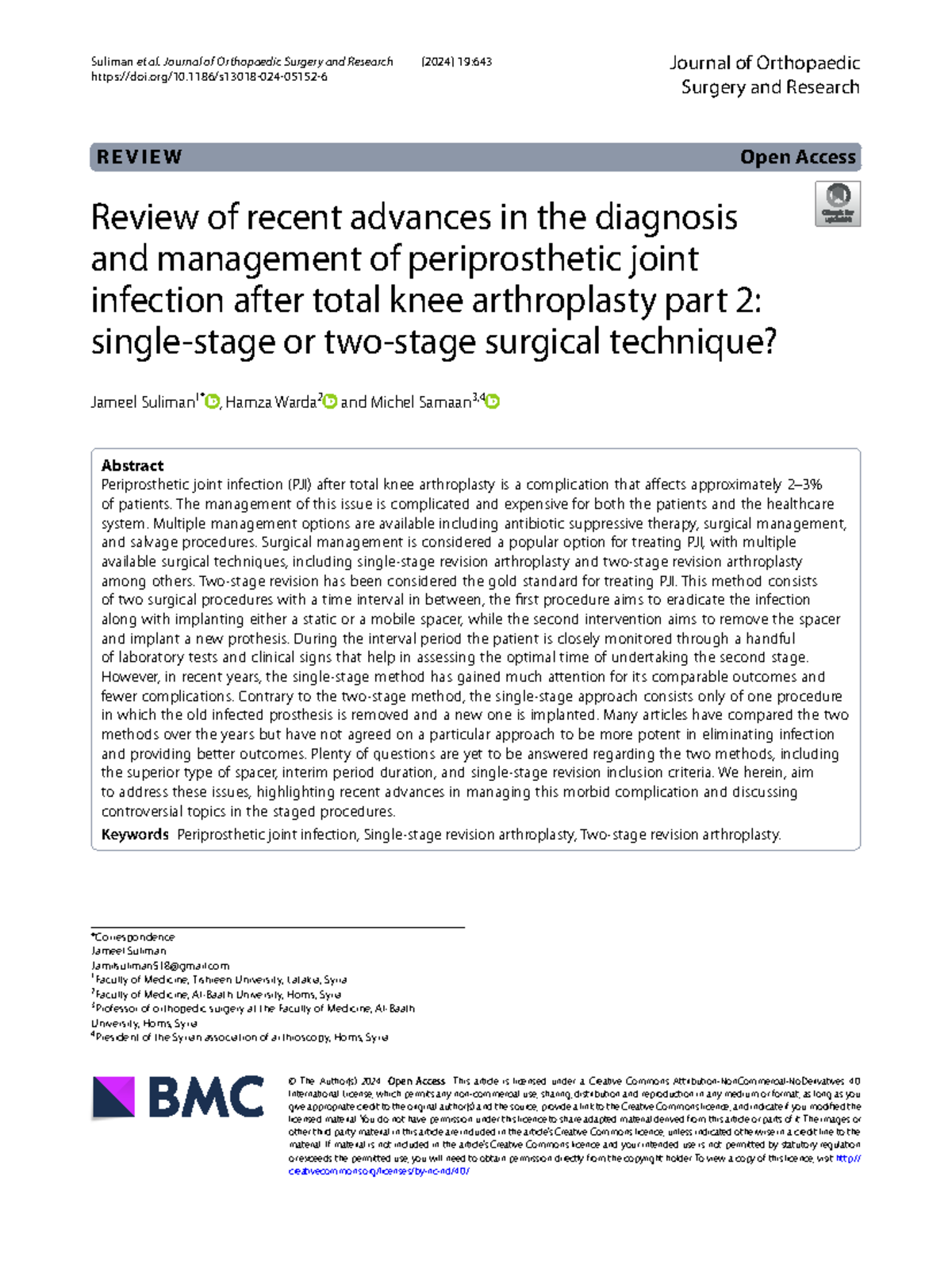 Review of Advances in Diagnosis & Management of PJI Post-TKA (2024 ...