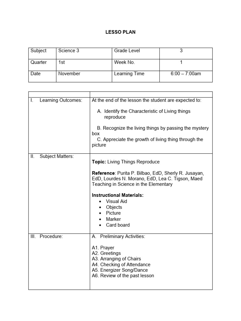 Lesson Plan Science Living Things Reproduction Grade 3 Final | PDF ...