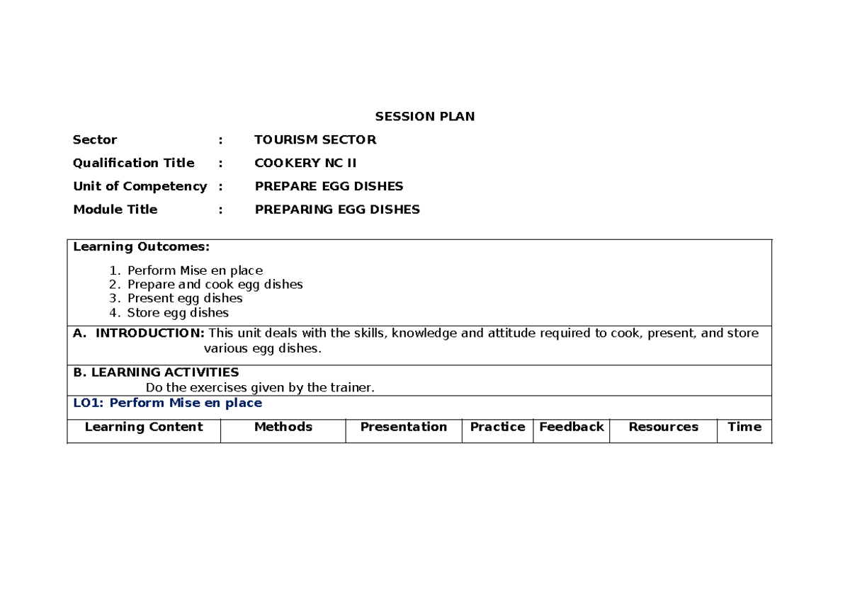 SESSION PLAN: COOKERY NC II - PREPARING EGG DISHES Module - Studocu