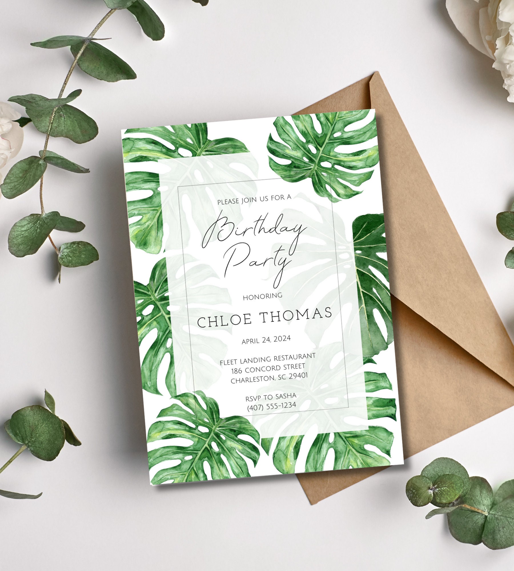 Editable Birthday Invitation, Monstera Plant, Watercolor, Tropical ...