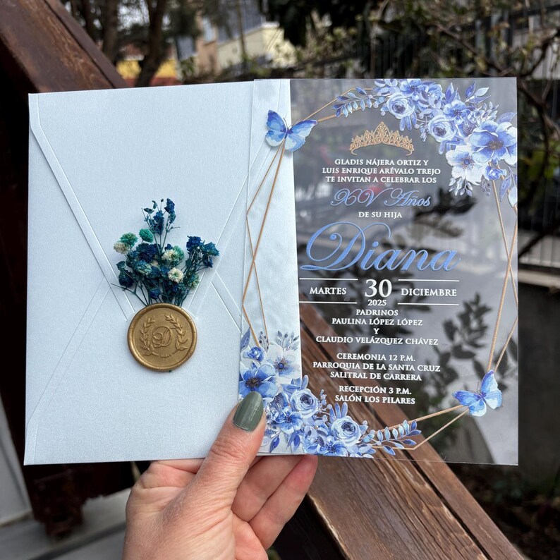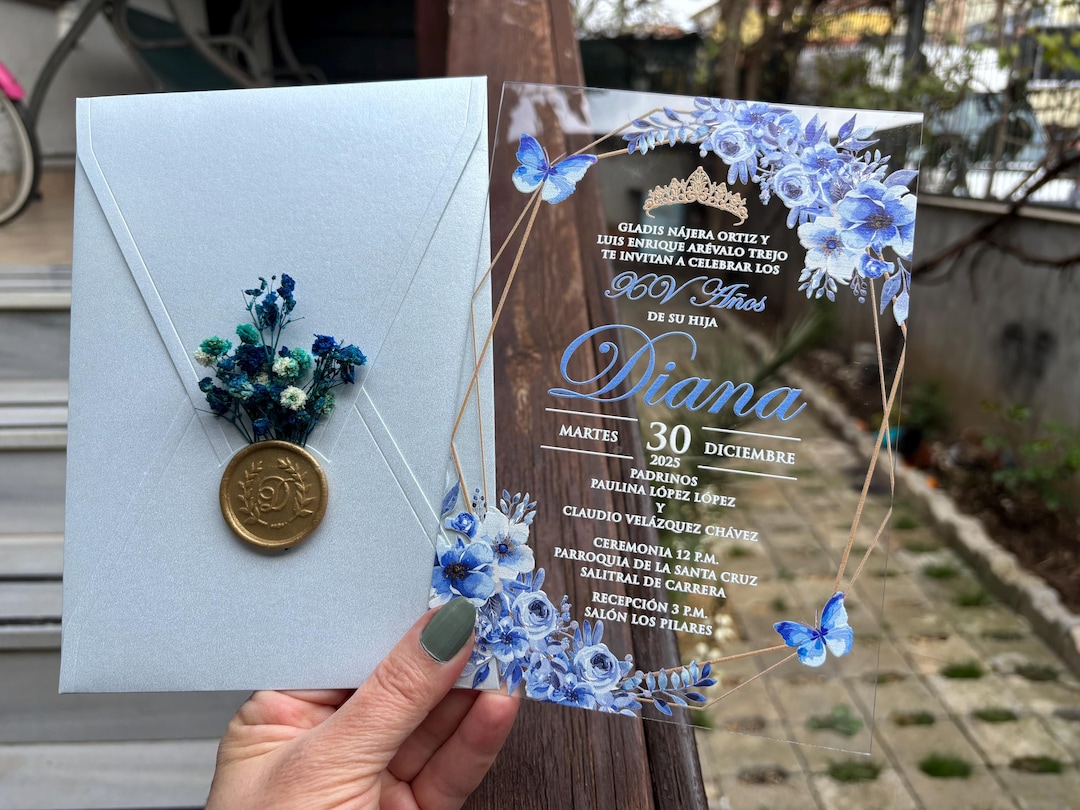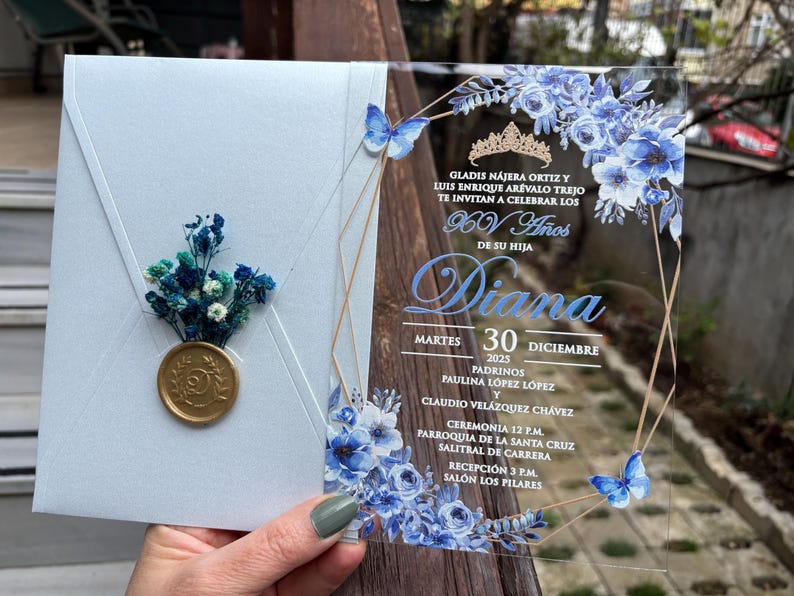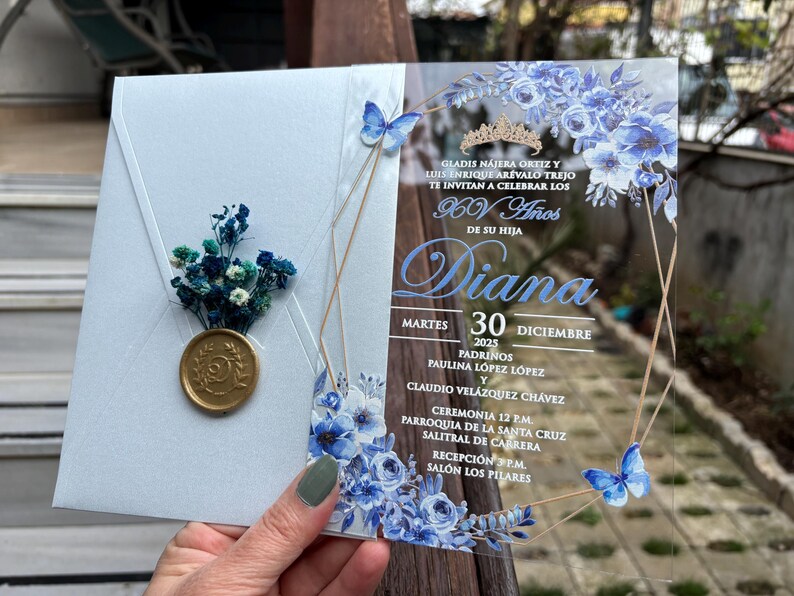 Dusty Blue Acrylic Invitation, Blue Butterfly Flowers, Wax Seal. - Etsy