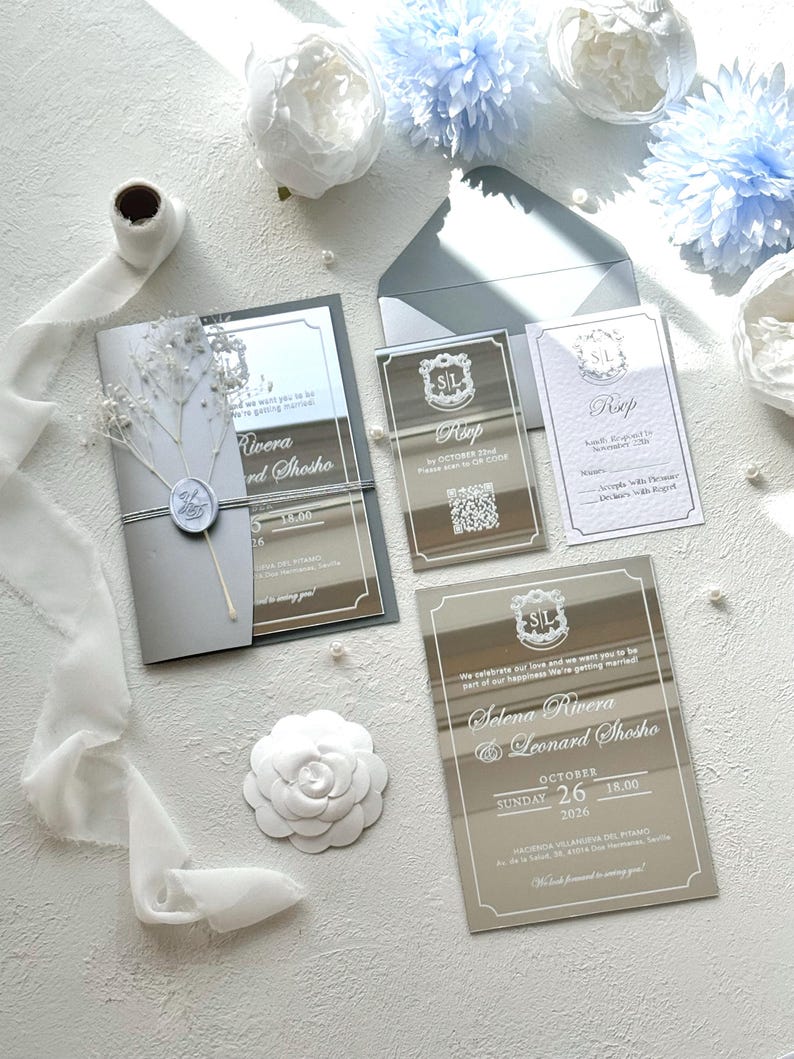 Elegant Silver Mirror Acrylic Wedding Invitations Set Silver Envelopes ...