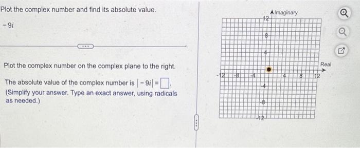 Solved: Plot the complex number and find its absolute value. -12+9i ...