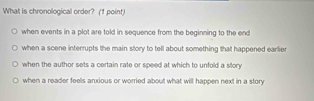 Solved: What is chronological order? (1 point) when events in a plot ...