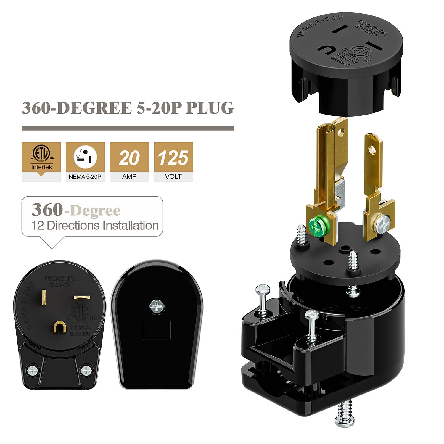 Snapklik.com : USA 3-Prong Male AC Plug, Right Angle ETL Nema 5-20P 3 ...