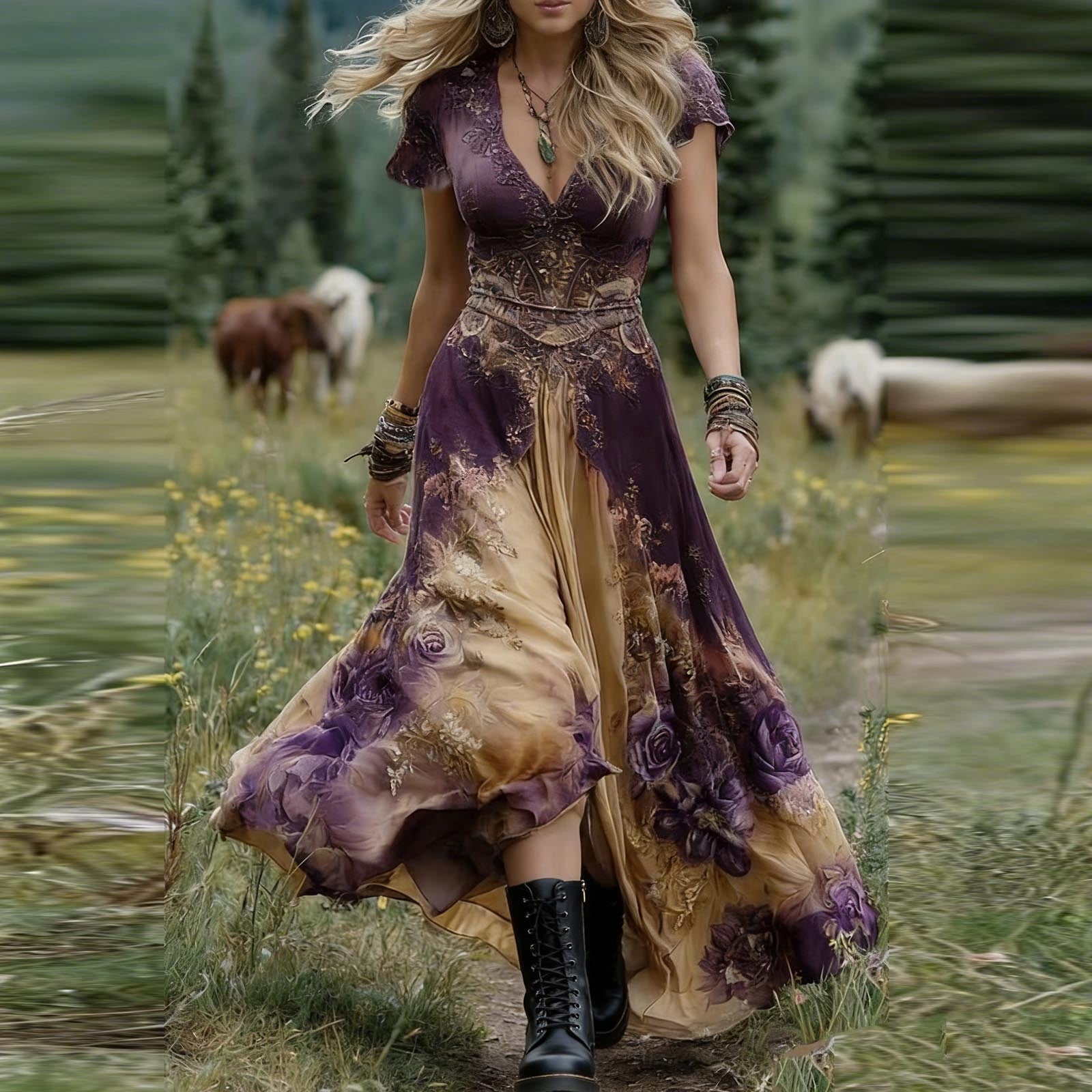 Ayolanni Boho Dresses for Women Tunic Maxi V-Neck Floral Dress Flutter ...