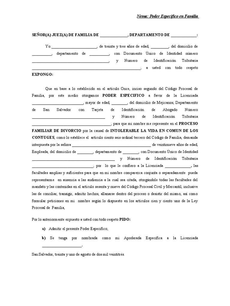 Poder Específico para Proceso Familiar de Divorcio - Modelo Jurídico ...