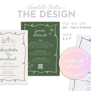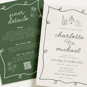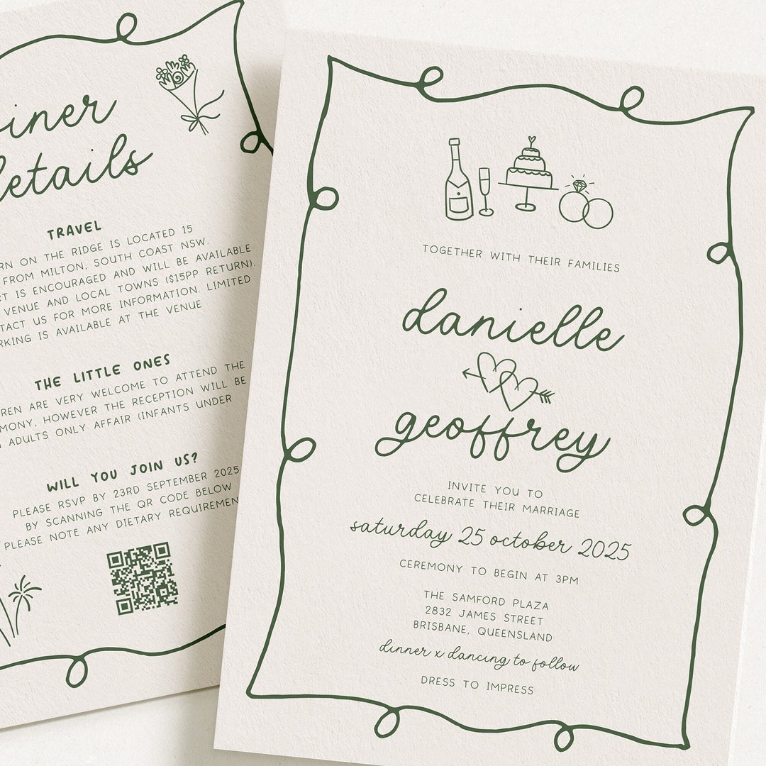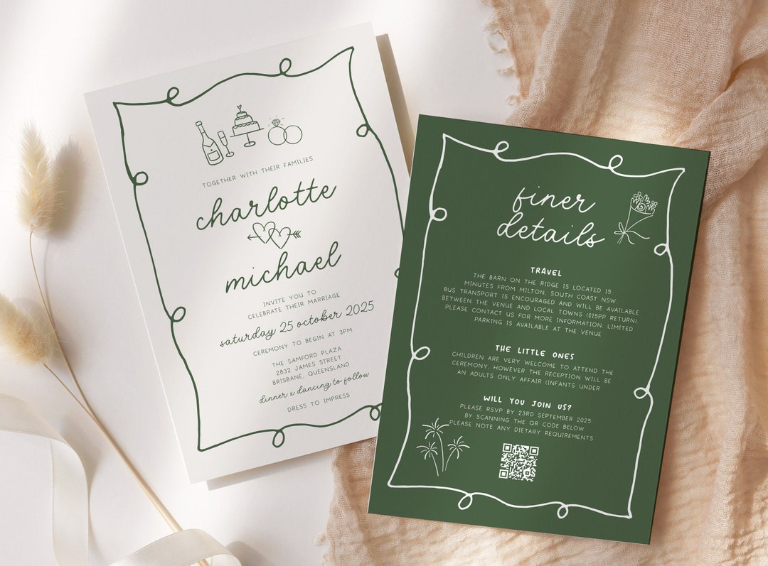 POET Modern Quirky Wedding Invitation Template, Green Hand Drawn Wave ...