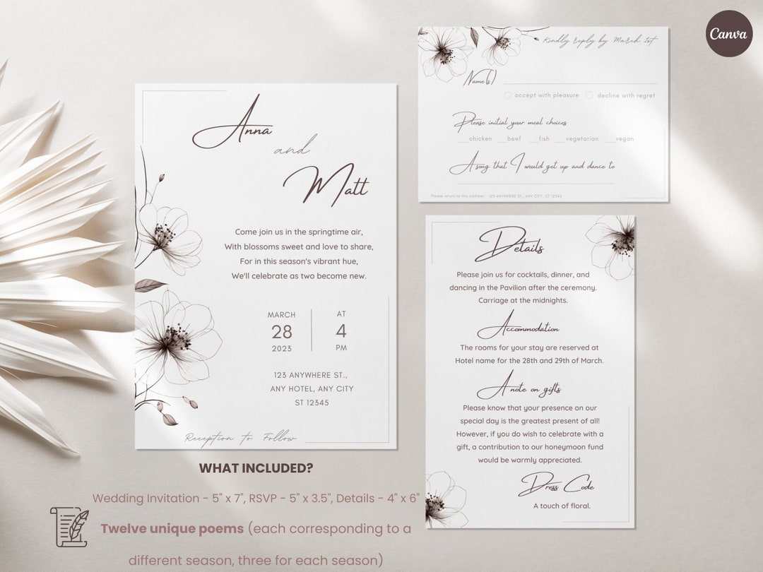 Botanical Wedding Invitation Suite Template With Unique Inviting Poems ...