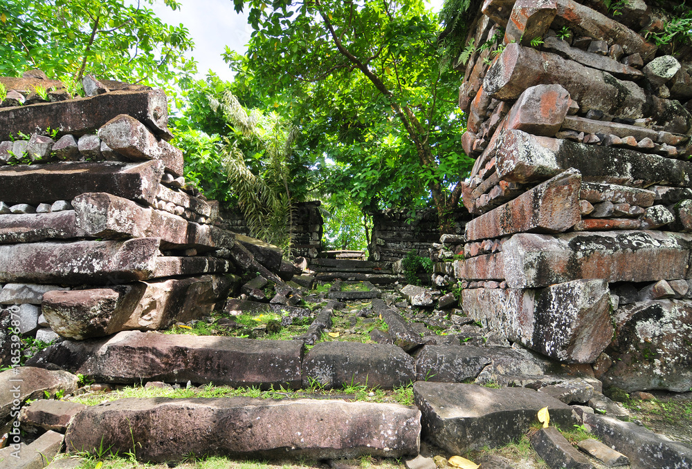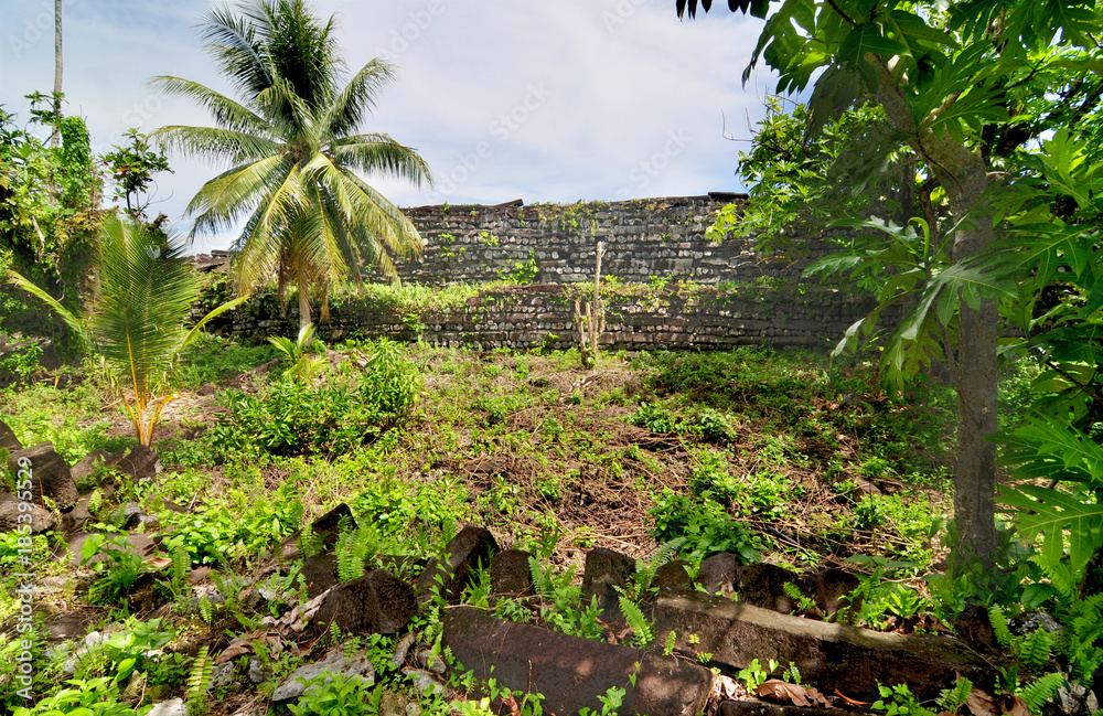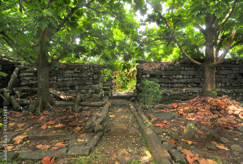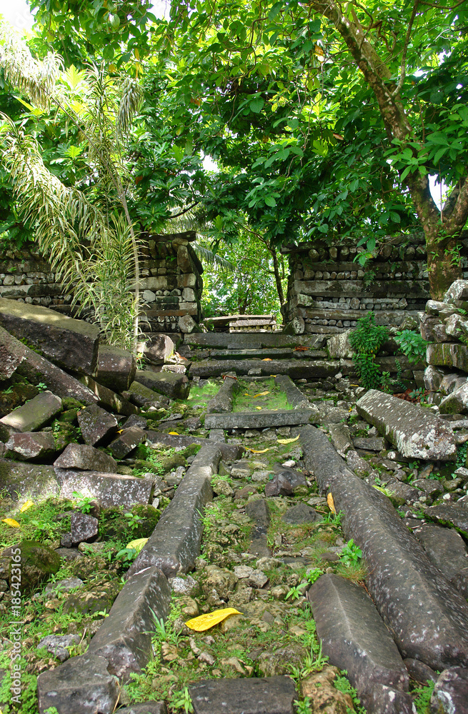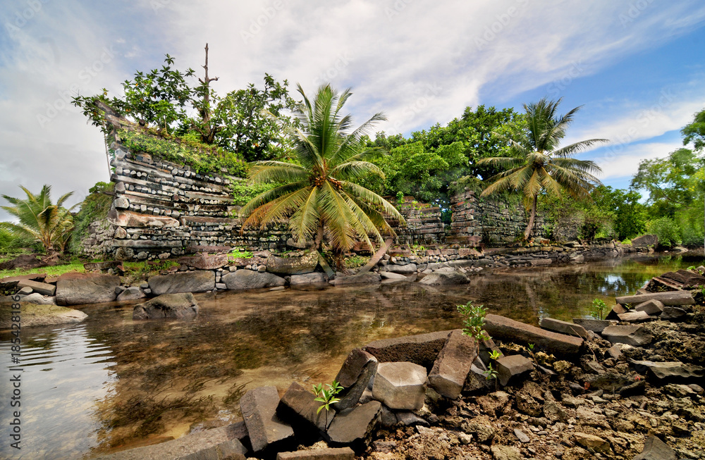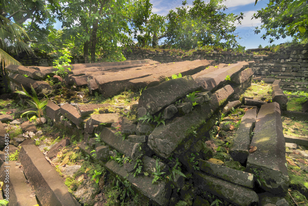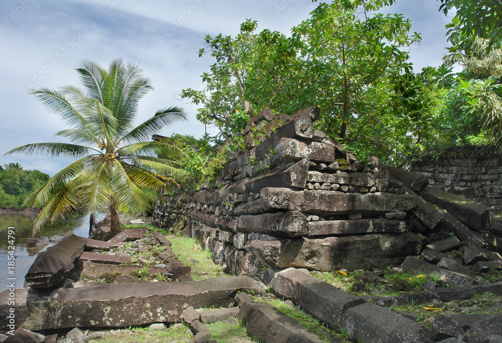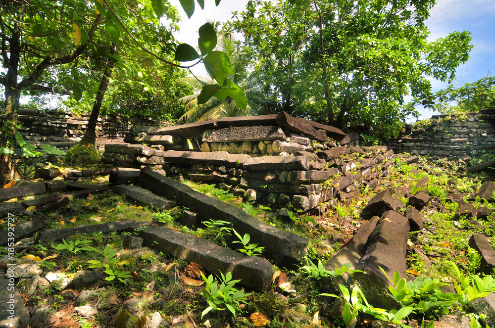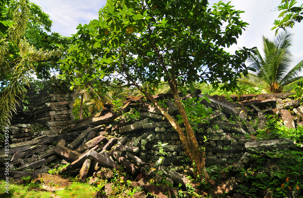Ruins of main building in the ancient city of Nan Madol on the tropical ...
