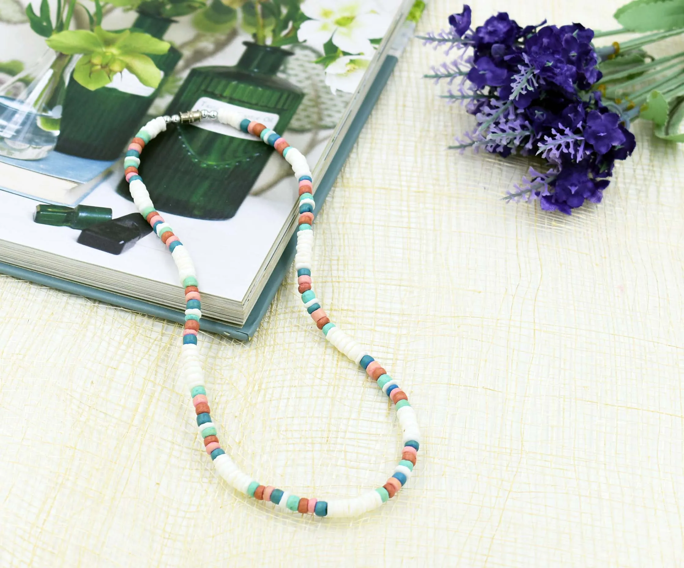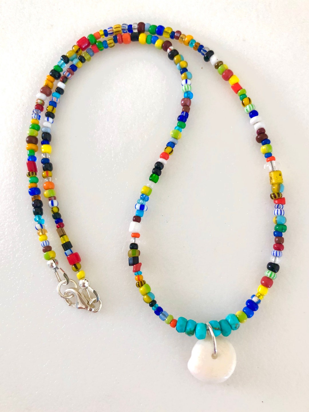 Puka Shell Turquoise Beaded Necklace, Multicolored African Seed Beads ...