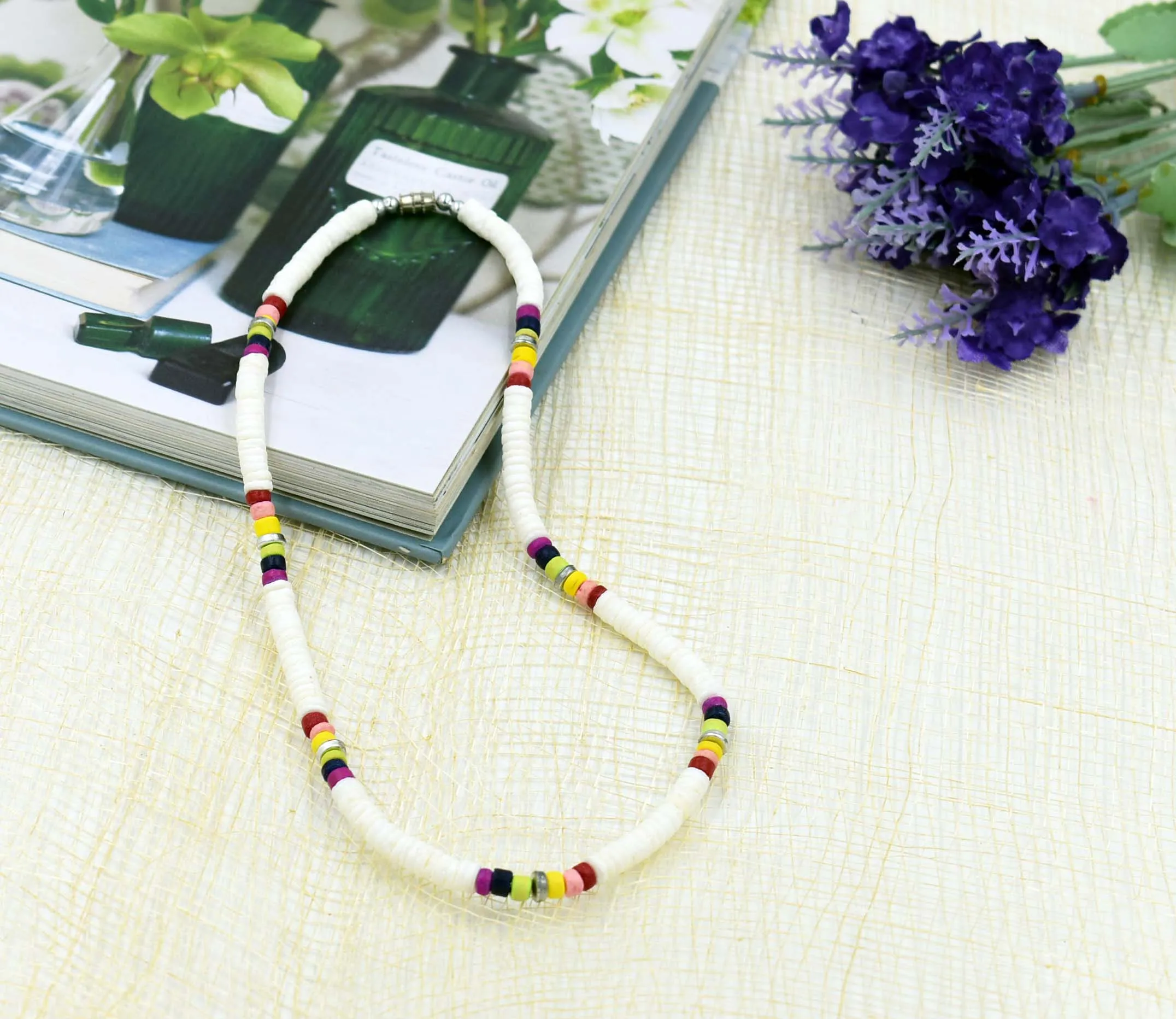 Round White Puka Shell & Vibrant Coconut Necklace - Bohemian Beach ...