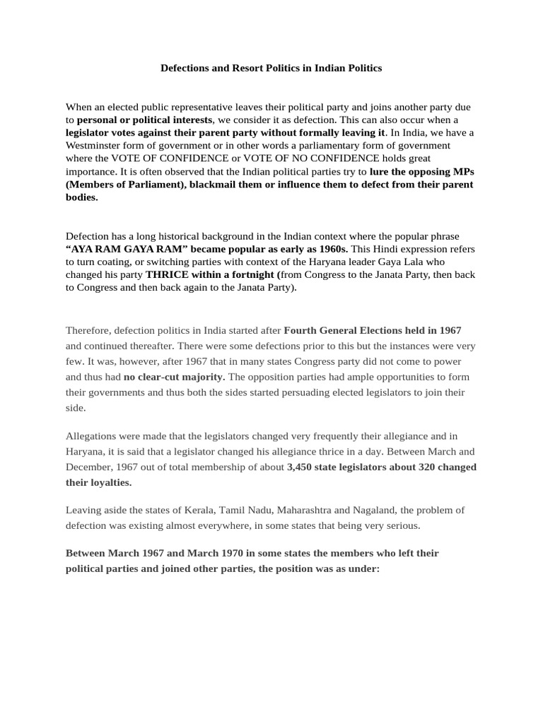 Defections and Resort Politics in Indian Politics | PDF | Government ...
