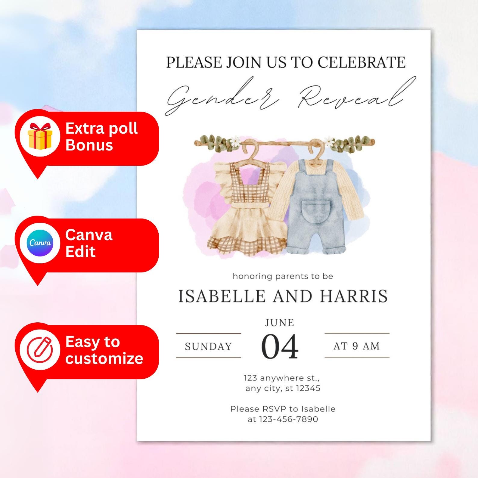 Editable Gender Reveal Invitation + Bonus Poll – Boho Neutral Canva ...
