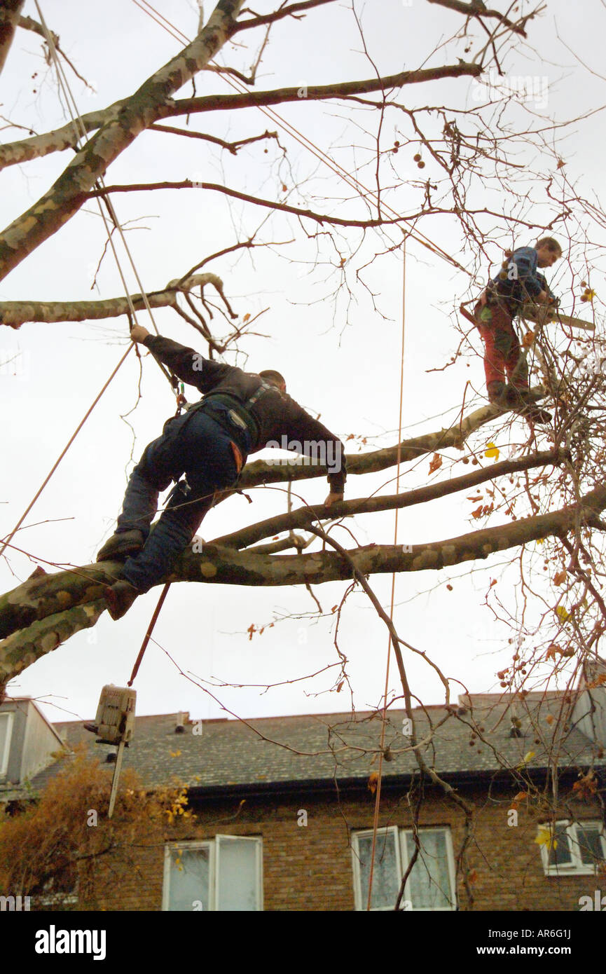 Tree surgeon at work pollarding a tree due to diseased branches Stock ...