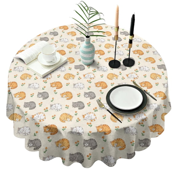 Cat Sleeping Floral Beige Pattern Round Tablecloth, Fits 60-Inch Table ...