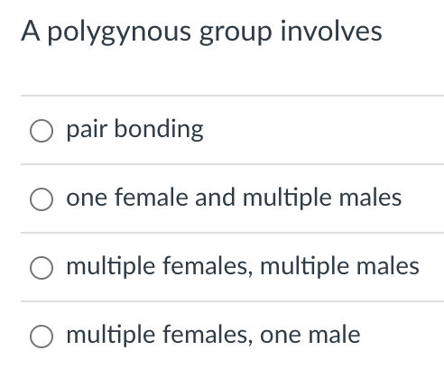 Solved A polygynous group involves O pair bonding one female | Chegg.com