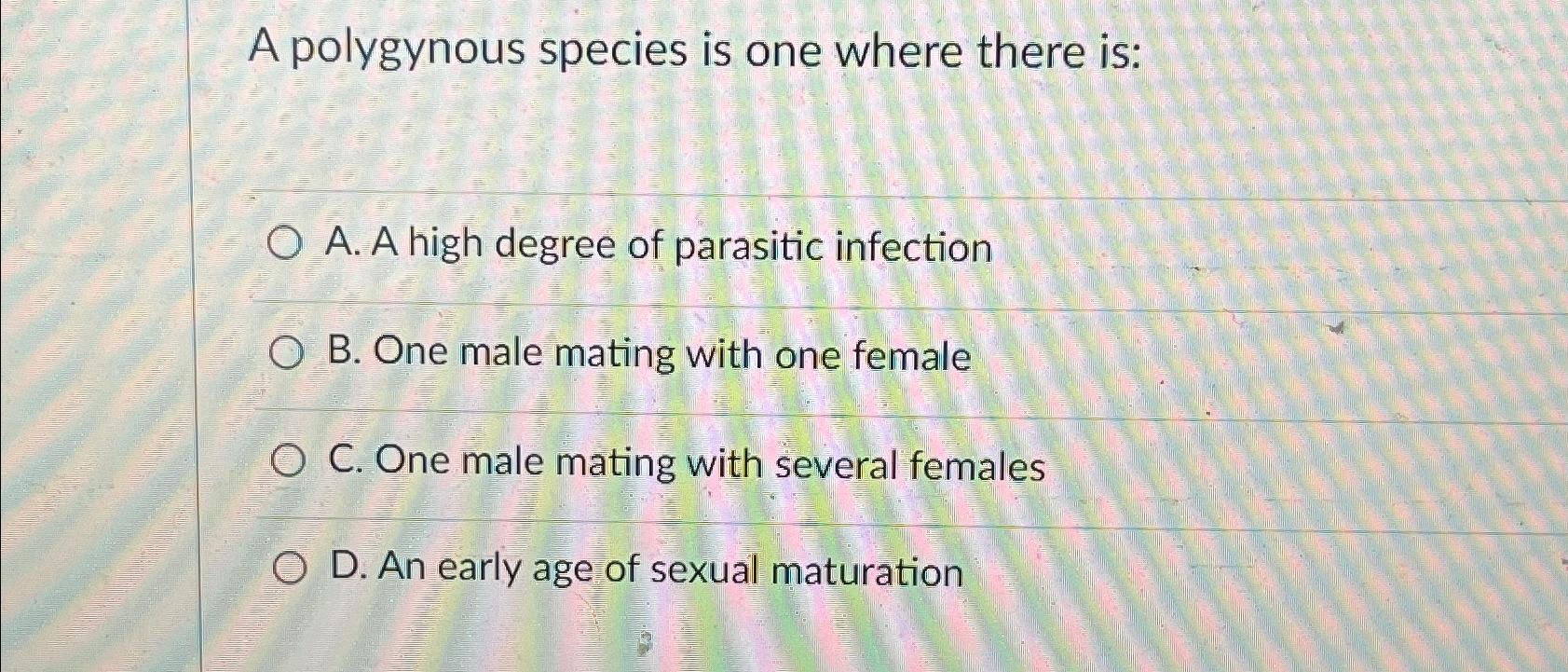 Solved A polygynous species is one where there is:A. A high | Chegg.com