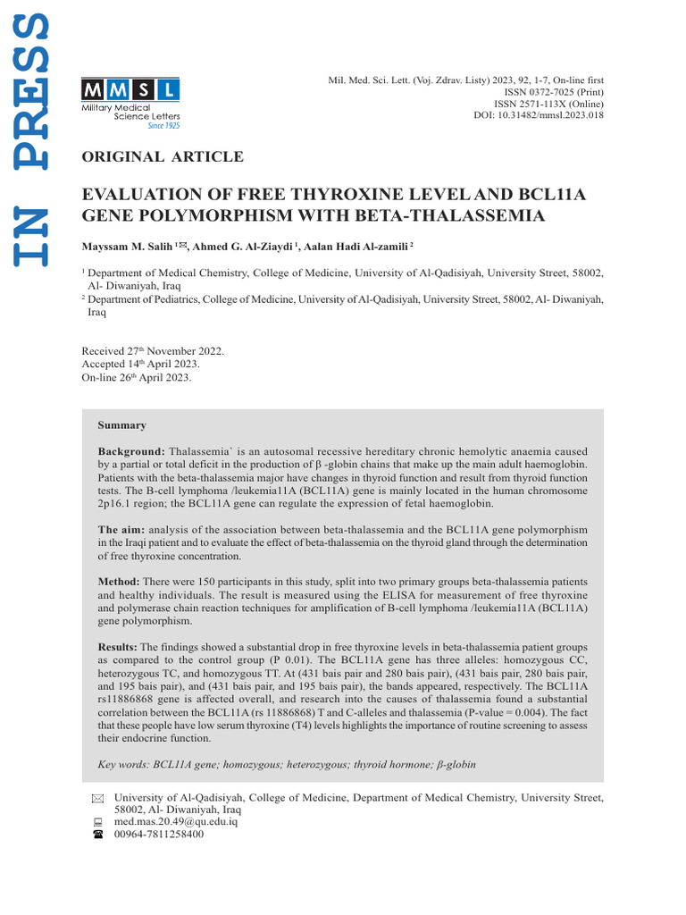 Evaluation of Free Thyroxine Level and Bcl11a Gene Polymorphism with ...