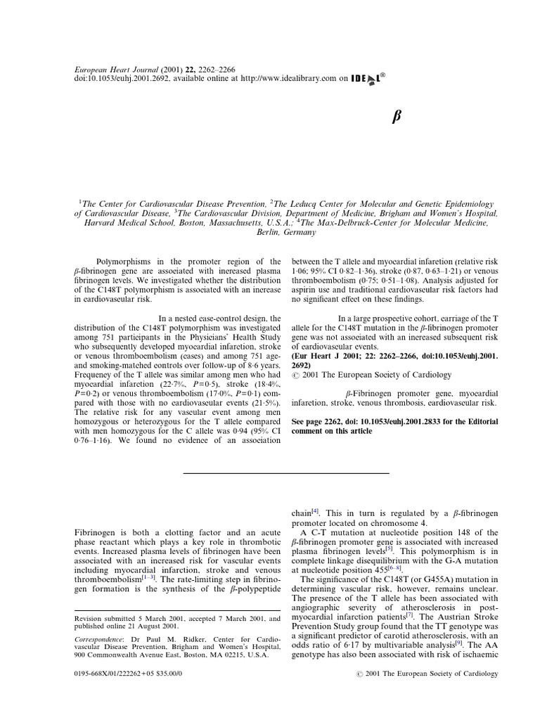 Beta Fibrinogen Polymorphism | PDF | Thrombosis | Blood Pressure