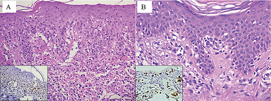 (A) Polymorphic skin eruption (crusty erythemato‐vesicular lesions ...