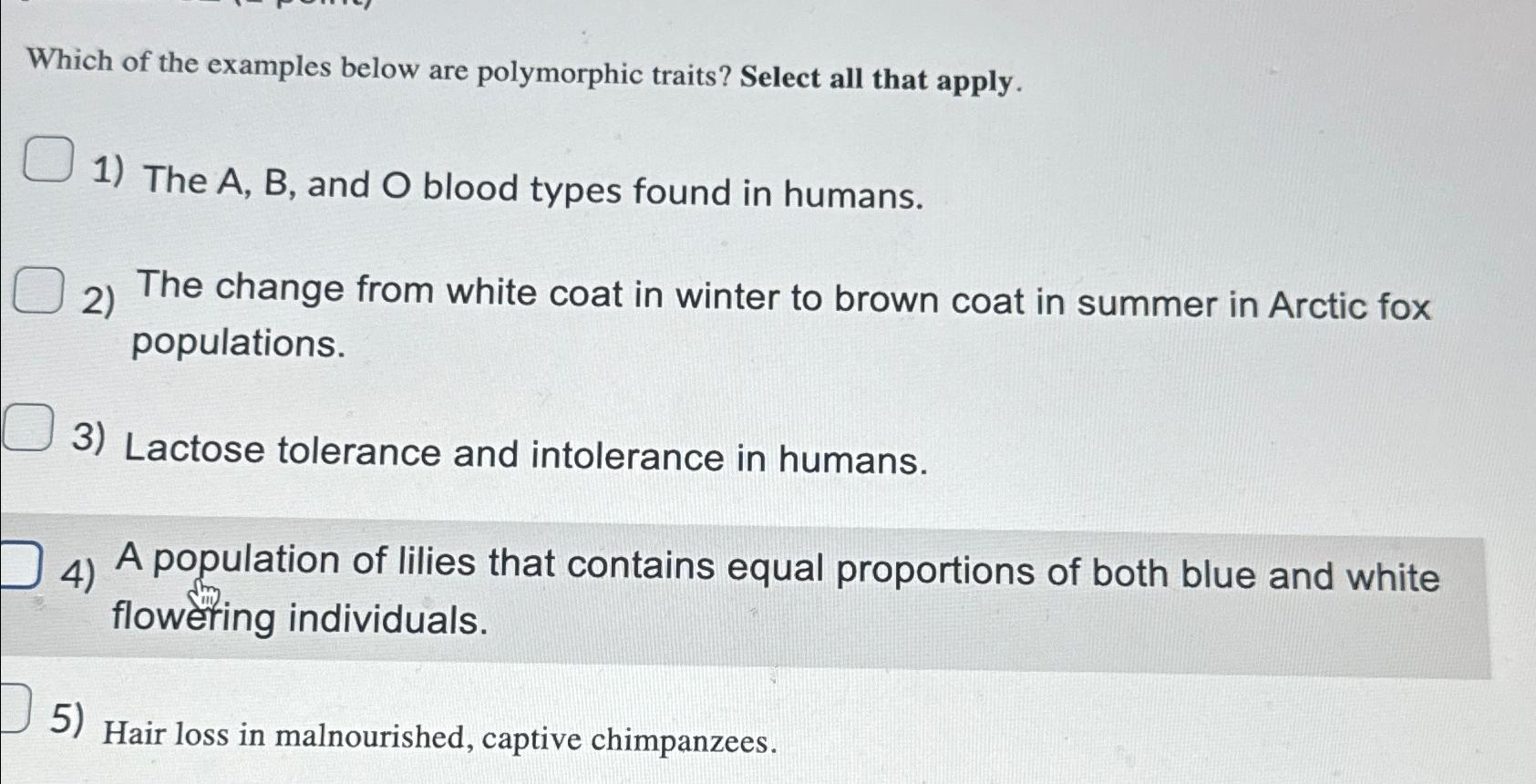 Solved Which of the examples below are polymorphic traits? | Chegg.com