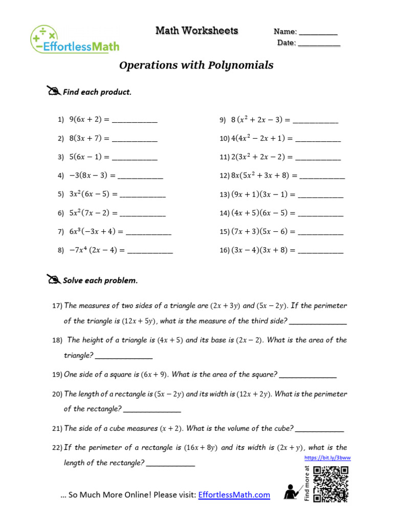 Operations with Polynomials Worksheet - Add, Subtract, and Multiply