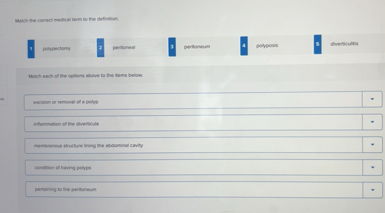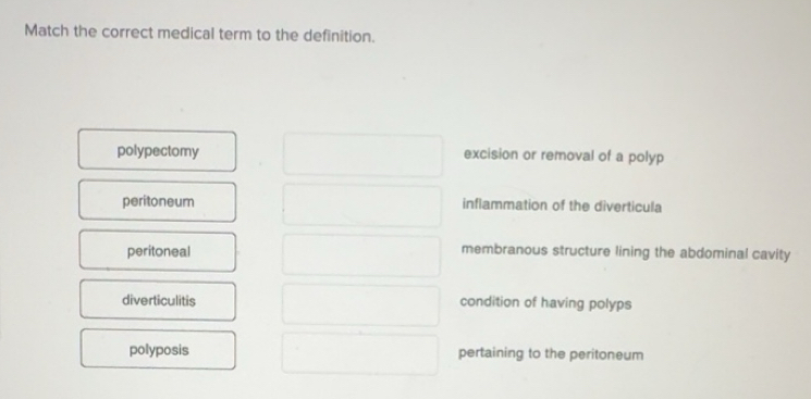 Solved: Match the correct medical term to the definition. polypectomy ...