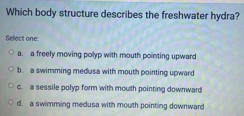 Solved: Which body structure describes the freshwater hydra? Select one ...